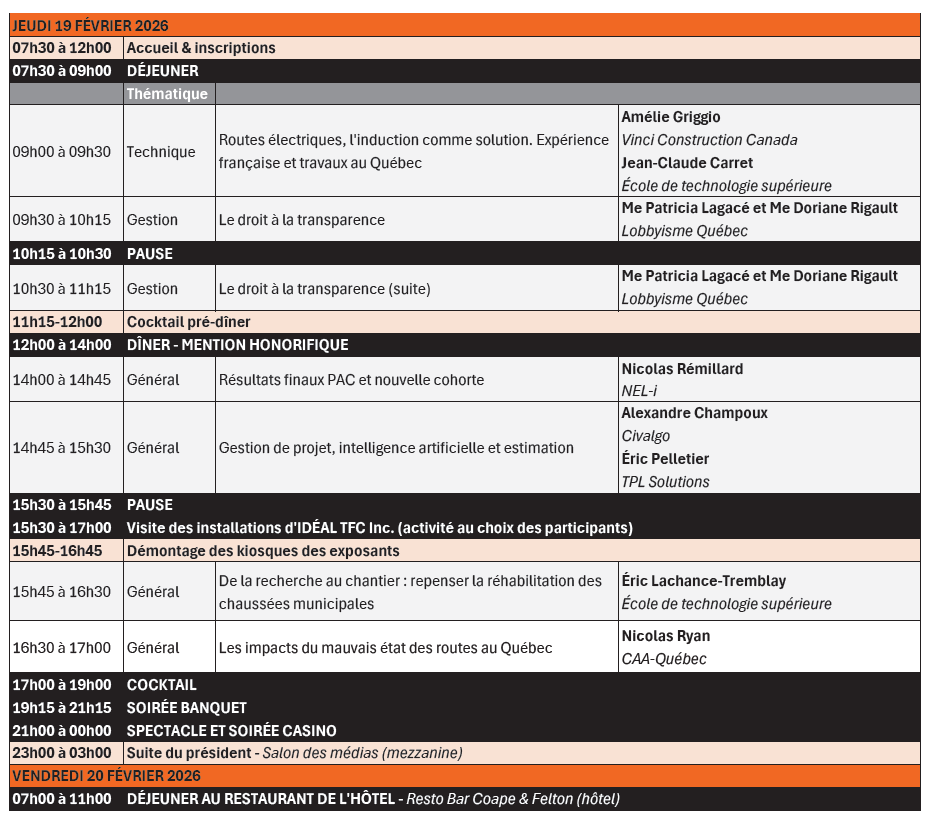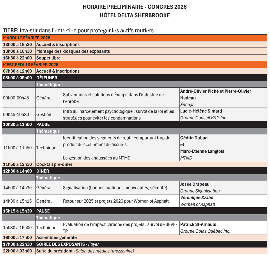 Pour cette 21e édition, nous continuons sur la même lancée que l’an dernier. Nous voulons garder le congrès dynamique et convivial pour tous! Il y aura un programme varié et enrichissant qui sera présenté aux participants avec des conférences pratiques auxquelles tous les membres pourront assister. Nous avons ajouté plus de technique cette année pour répondre aux besoins de tous. Il y aura, comme l’an dernier, plus de réseautage et d’activités sociales. Nous attendons en grand nombre les décideurs et gestionnaires de tous les niveaux des entreprises de l’association. Nous réunirons des présentateurs qualifiés qui sauront transmettre leurs connaissances aux participants de manière ludique et concrète et nous permettrons aux participants de se réunir à plus de moments. De plus, comme à chaque année, nous remettrons une mention honorifique à une personne de l’industrie qui a su se démarquer et faire avancer l’industrie au fil de sa carrière. Ainsi, si vous souhaitez contribuer à un congrès qui permettra à ses participants d'améliorer leurs connaissances techniques et opérationnelles ou encore en gestion de projets, votre implication à titre de partenaire principal est la bienvenue!